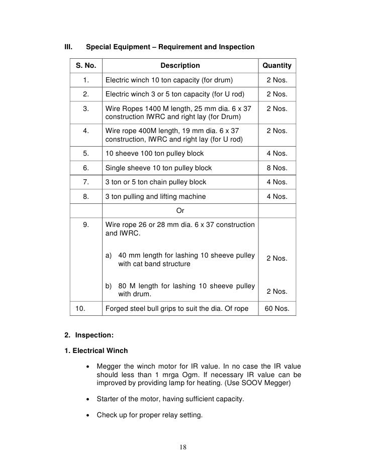 - 18. III. Special Equipment – Requirement and Inspection S. No. Description Quantity 1. Electric winch 10 ton capacity (for drum) 2 Nos. 2. Electric winch 3 or 5 ton capacity (for U rod) 2 Nos. 3. Wire Ropes 1400 M length, 25 mm dia. 6 x 37 2 Nos. construction IWRC and right lay (for Drum) 4. Wire rope 400M length, 19 mm dia. 6 x 37 2 Nos. construction, IWRC and right lay (for U rod) 5. 10 sheeve 100 ton pulley block 4 Nos. 6. Single sheeve 10 ton pulley block 8 Nos. 7. 3 ton or 5 ton chain pulley block 4 Nos. 8. 3 ton pulling and lifting machine 4 Nos. Or 9. Wire rope 26 or 28 mm dia. 6 x 37 construction and IWRC. a) 40 mm length for lashing 10 sheeve pulley 2 Nos. with cat band structure b) 80 M length for lashing 10 sheeve pulley with drum. 2 Nos. 10. Forged steel bull grips to suit the dia. Of rope 60 Nos.2. Inspection:1. Electrical Winch Megger the winch motor for IR value. In no case the IR value should less than 1 mrga Ogm. If necessary IR value can be improved by providing lamp for heating. (Use SOOV Megger) Starter of the motor, having sufficient capacity. Check up for proper relay setting. 18