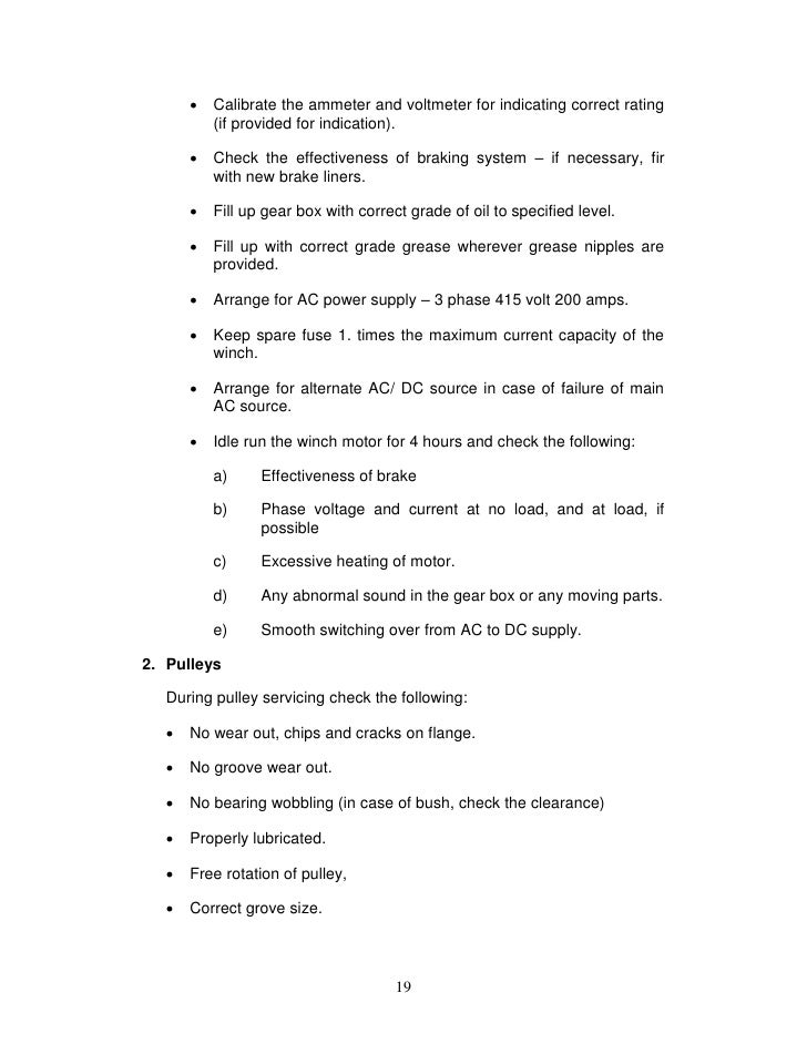 - 19. Calibrate the ammeter and voltmeter for indicating correct rating (if provided for indication). Check the effectiveness of braking system – if necessary, fir with new brake liners. Fill up gear box with correct grade of oil to specified level. Fill up with correct grade grease wherever grease nipples are provided. Arrange for AC power supply – 3 phase 415 volt 200 amps. Keep spare fuse 1. times the maximum current capacity of the winch. Arrange for alternate AC/ DC source in case of failure of main AC source. Idle run the winch motor for 4 hours and check the following: a) Effectiveness of brake b) Phase voltage and current at no load, and at load, if possible c) Excessive heating of motor. d) Any abnormal sound in the gear box or any moving parts. e) Smooth switching over from AC to DC supply.2. Pulleys During pulley servicing check the following: No wear out, chips and cracks on flange. No groove wear out. No bearing wobbling (in case of bush, check the clearance) Properly lubricated. Free rotation of pulley, Correct grove size. 19
