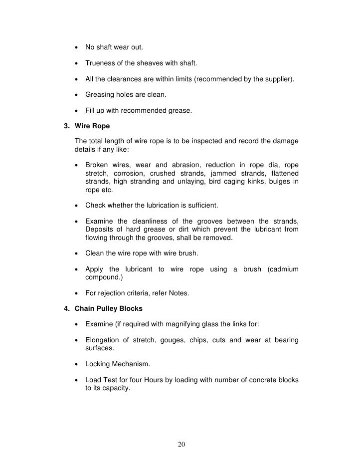 - 20. No shaft wear out. Trueness of the sheaves with shaft. All the clearances are within limits (recommended by the supplier). Greasing holes are clean. Fill up with recommended grease.3. Wire Rope The total length of wire rope is to be inspected and record the damage details if any like: Broken wires, wear and abrasion, reduction in rope dia, rope stretch, corrosion, crushed strands, jammed strands, flattened strands, high stranding and unlaying, bird caging kinks, bulges in rope etc. Check whether the lubrication is sufficient. Examine the cleanliness of the grooves between the strands, Deposits of hard grease or dirt which prevent the lubricant from flowing through the grooves, shall be removed. Clean the wire rope with wire brush.