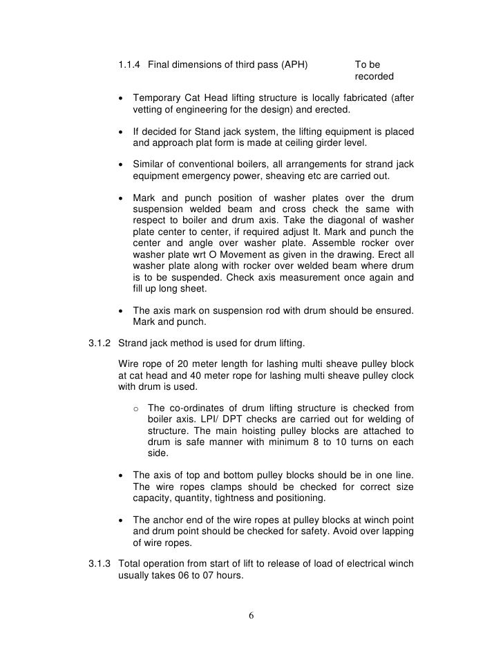 - 6. 1.1.4 Final dimensions of third pass (APH) To be recorded Temporary Cat Head lifting structure is locally fabricated (after vetting of engineering for the design) and erected. If decided for Stand jack system, the lifting equipment is placed and approach plat form is made at ceiling girder level. Similar of conventional boilers, all arrangements for strand jack equipment emergency power, sheaving etc are carried out. Mark and punch position of washer plates over the drum suspension welded beam and cross check the same with respect to boiler and drum axis. Take the diagonal of washer plate center to center, if required adjust It. Mark and punch the center and angle over washer plate. Assemble rocker over washer plate wrt O Movement as given in the drawing. Erect all washer plate along with rocker over welded beam where drum is to be suspended. Check axis measurement once again and fill up long sheet. The axis mark on suspension rod with drum should be ensured. Mark and punch.3.1.2 Strand jack method is used for drum lifting. Wire rope of 20 meter length for lashing multi sheave pulley block at cat head and 40 meter rope for lashing multi sheave pulley clock with drum is used. o The co-ordinates of drum lifting structure is checked from boiler axis. LPI/ DPT checks are carried out for welding of structure. The main hoisting pulley blocks are attached to drum is safe manner with minimum 8 to 10 turns on each side. The axis of top and bottom pulley blocks should be in one line. The wire ropes clamps should be checked for correct size capacity, quantity, tightness and positioning. The anchor end of the wire ropes at pulley blocks at winch point and drum point should be checked for safety. Avoid over lapping of wire ropes.3.1.3 Total operation from start of lift to release of load of electrical winch usually takes 06 to 07 hours. 6